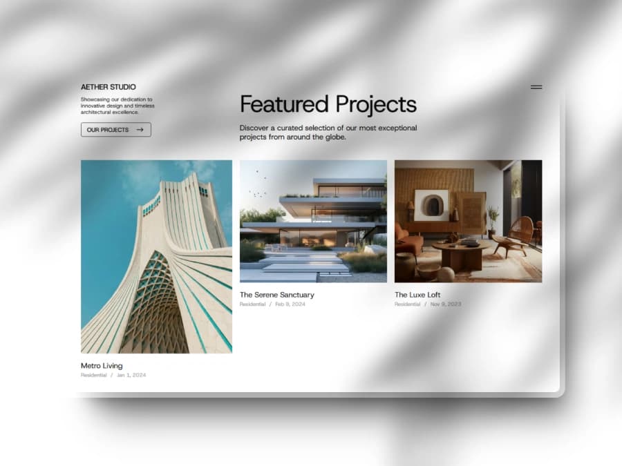 Whether you're an architecture firm, interior design studio, or construction brand, Aether Studio is built to showcase your projects with precision, sophistication, and a user-centric approach.